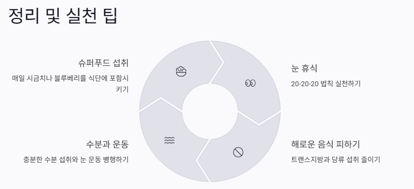 지금까지 살펴본 눈 건강 식품과 습관들, 꾸준히 실천하면 정말 큰 변화를 느낄 수 있어요. 마지막으로 눈 건강을 위한 간단한 실천 팁을 정리해드릴게요.