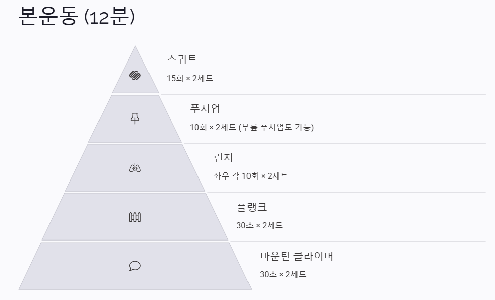 - 런지 – 좌우 각 10회 × 2세트